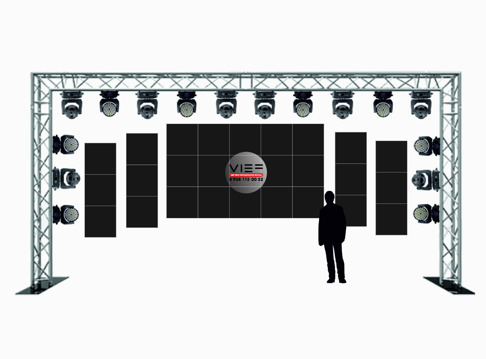 Сцена “как шоу”: центральный экран + боковые полосы для динамики.
